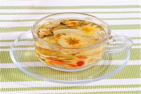 茉莉花能抗菌、平喘、抗癌、强心益肝、降低血压;槐花具有清心、润肺、平肝明目作用,可预防角膜炎;菊花能清肝明目。此茶可平肝祛风、清火降压。