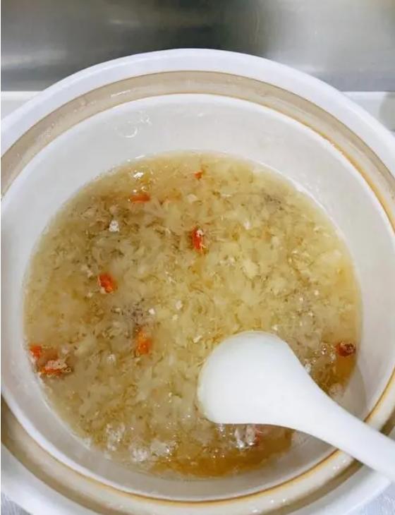 2、干银耳用温热水发透择去杂质,揉碎,淘洗干净。冰糖用水溶化后,置文火上熬至色微黄时过滤待用。