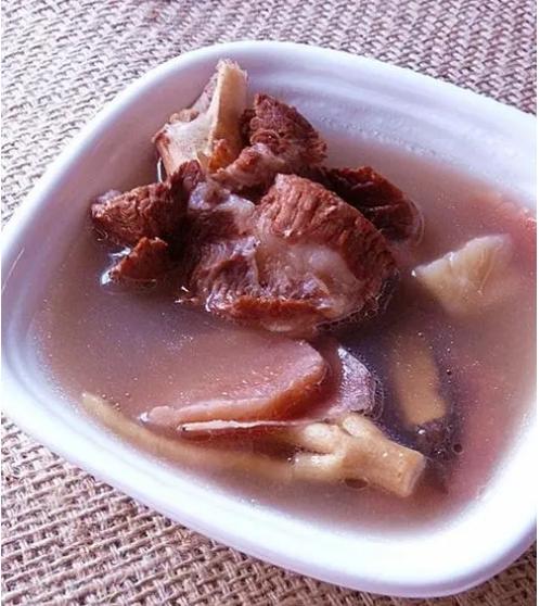 ① 先将猪脊骨洗净剁碎,放入锅中,加水适量 ② 小火炖煮,熬汤至约1200 克,去猪脊骨及浮油 ③ 加入土茯苓,再熬汤至800克即成。