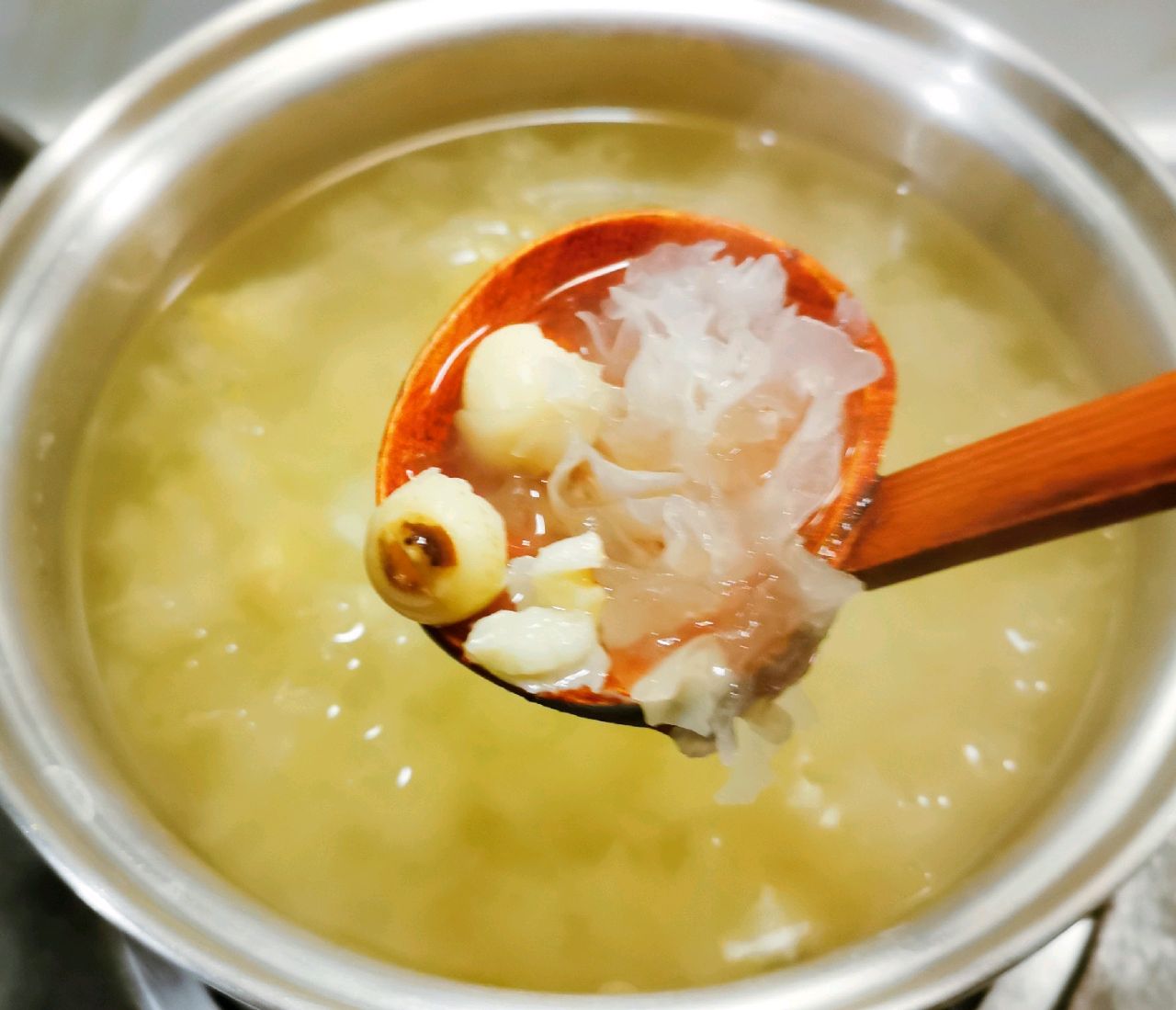 ④ 烧开鸡清汤,加入黄酒、盐、白糖、味精少许后,注入银耳莲子碗中即成