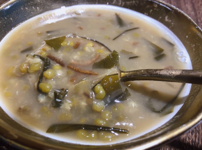 ① 先将粳米淘洗干净,将海带切成花色形状的块 ② 把锅放火上加水烧开,放入陈皮、海带 ③ 用旺火烧开后,煮沸约10分钟 ④ 再下粳米和适量熟猪油,开锅后用小火继续熬煮,至米粒开花、海带变酥,放适量盐和葱花,搅拌均匀即成