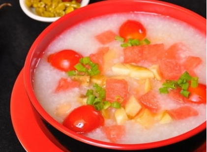将西红柿洗净后切碎,与淘洗干净的粳米一同煮粥。